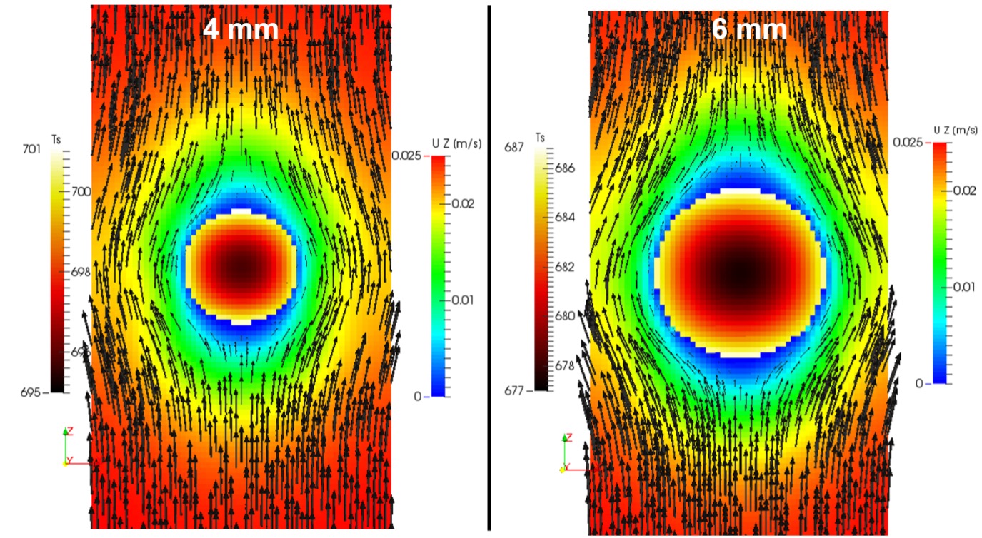 Contours of particle temperature and flow velocity for two plastic particles with different sizes.