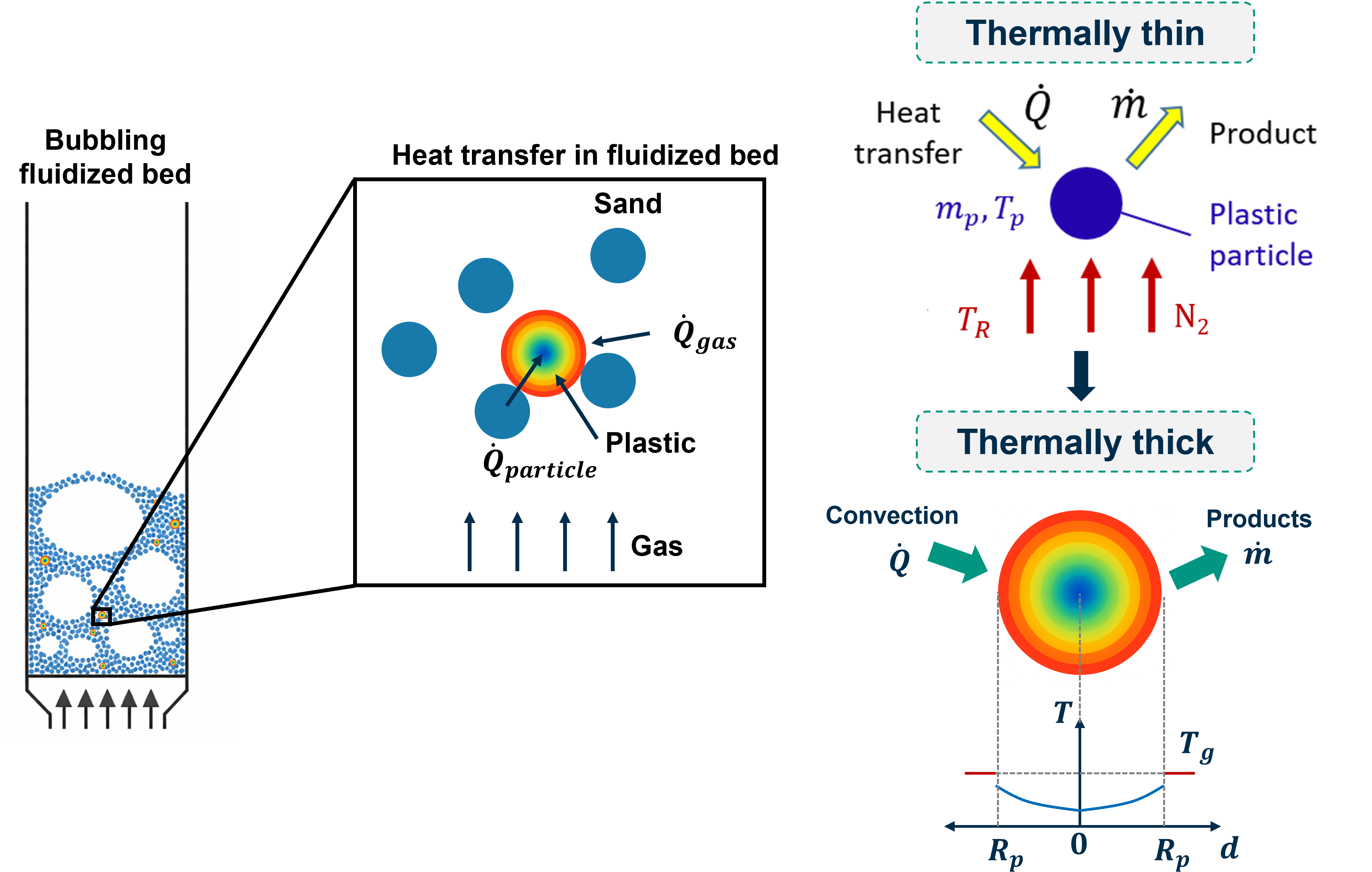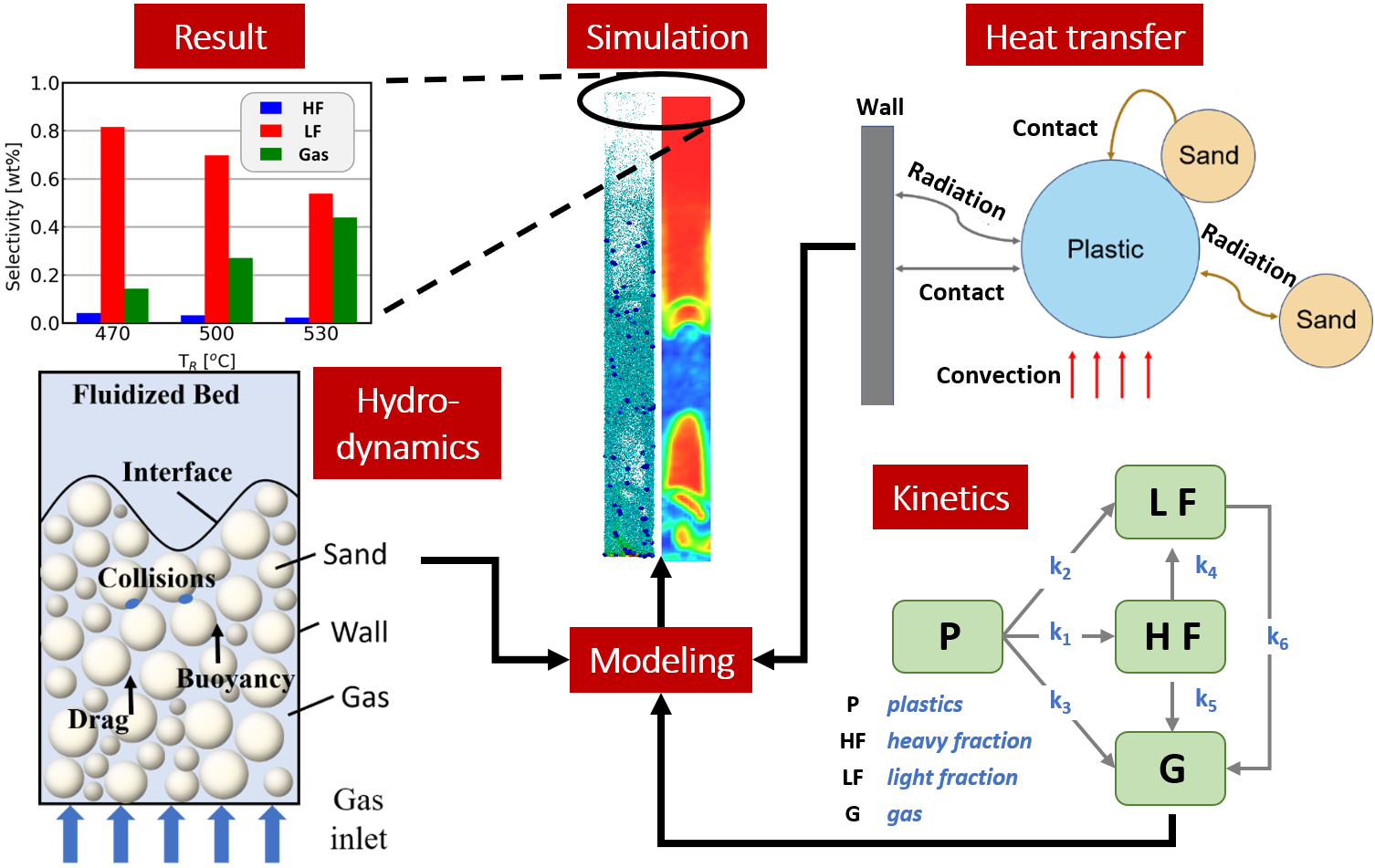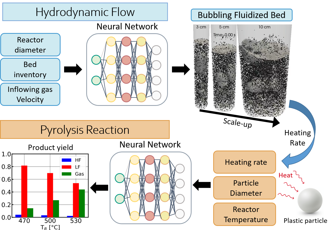 Integrated modeling framework for fluidized-bed plastic pyrolysis, coupling hydrodynamics, heat transfer and chemistry.