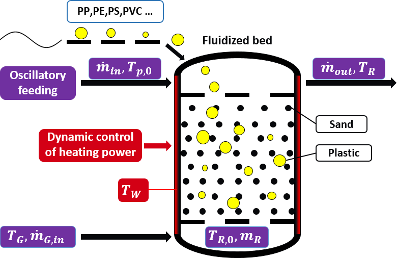 Conceptual schematic of homogeneous reactor model for fluidized-bed plastic pyrolysis with continuous feeding.