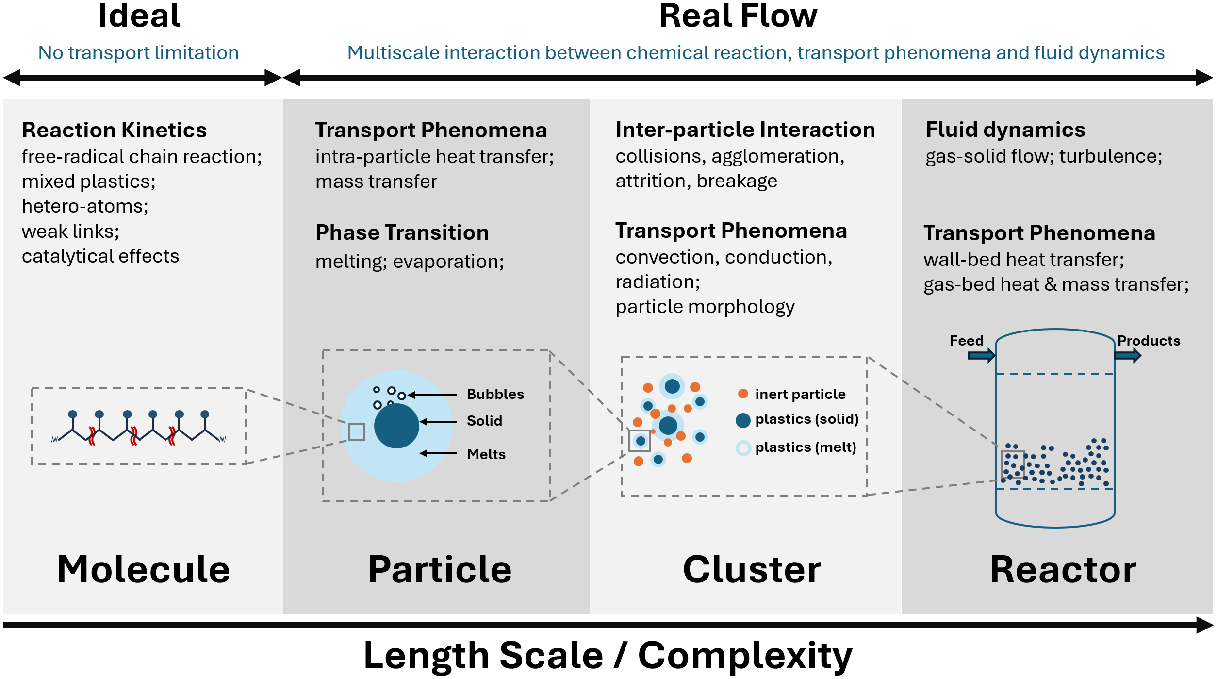 Overview of multiscale physio-chemical phenomena during plastic pyrolysis.